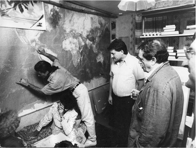 Показываю участникам 2-го Боспорского форума и своим гостям впадину в Мировом океане, географически противоположную Крымскому п-ову и подозрительно совпадающую с ним по очертаниям. Картографическая геопоэтика — или, по А. Балдину, «географика» — туманная область законных спекуляций и интригующих гипотез:) Слева направо: