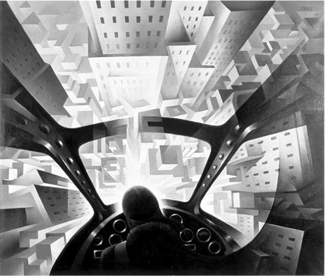 Tullio Crali, «Incuneandosi nell’abitato», 1939. В русских публикациях название звучит невинно: «Погружаясь в городское пространство».