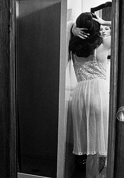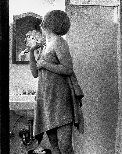 Однако уже «Кадр из фильма без названия № 81» (1979) отличается необычайной глубиной резкости [6], и, соответственно, /дистанция/ исчезает – хотя кадр заблокирован дверным проемом, а это подразумевает, что зритель опять рассматривает женщину извне того пространства, которое она занимает физически. Как и в других случаях, все здесь говорит о том, что женщина находится в ванной, и она так же почти раздета: на ней – лишь полупрозрачная ночная сорочка. Однако перспектива, устанавливаемая фокусным расстоянием, создает полное впечатление, что ее взгляд на себя в зеркало, минуя собственное отражение, устремлен также на наблюдателя [2]. Это значит, что в противовес идее /дистанции/ тут задействовано означаемое /связи/, и на уровне нарратива выделяется и другое означаемое – а именно возможность того, что эта женщина перед тем, как отправиться спать, болтает с кем-то (быть может, с подругой) [3] в комнате за порогом ванной.