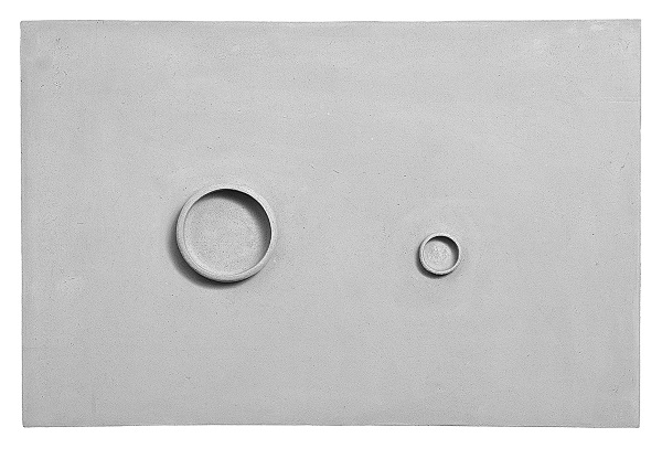 Вещь из серии, включающей шестнадцать работ, которые лежали на столах, – то ли миниатюрных глиняных пейзажей, то ли картин, то ли метафизических карт. Каждая – отдельный мир, особая композиция и в то же время – просто плитка. Чудесное автономное пространство в духе Моранди. Мне нравится.