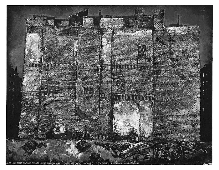 Художник, умерший молодым в 1999 году, недооценен и заслуживает большего, чем полагают многие. Замысловатая техника с использованием кирпича заставляет увидеть в этой картине плод любовного труда, образец плоской скульптуры и еще стену из воспоминаний автора.