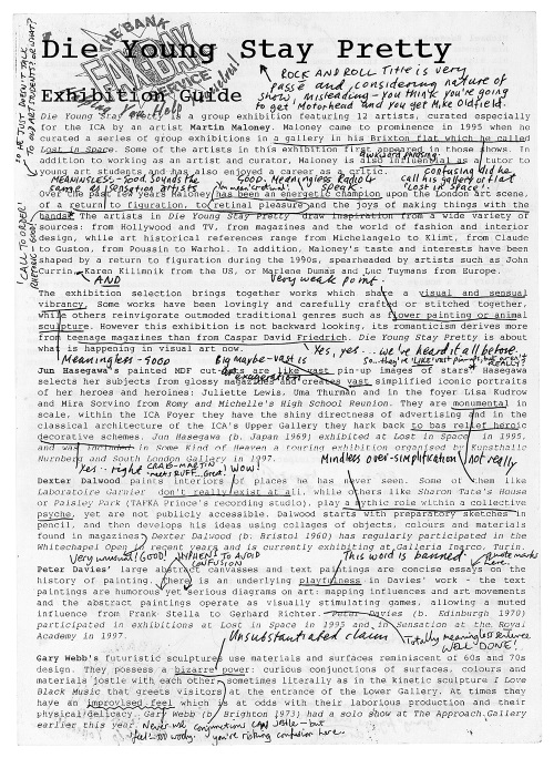 Реакция арт-сообщества оказалась очень разной: одни приветствовали результаты, представленные Левином и Рул, другие скептически отнеслись и к их методике, и к полученным данным. Разгорелись дебаты[3]. Многие посчитали, что, направив критику на типовой галерейный пресс-релиз, авторы статьи выбрали самую легкую и уязвимую мишень. «Разоблачение» пустословия текстов о современном искусстве, предпринятое Левином и Рул, в сущности лишь выявило один из курьезов арт-мира, который уже много лет служит поводом для насмешек. Еще в 1999 году в проекте Fax-Back (1999; ил. 1) художники британской группы BANK собрали особенно нелепые пресс-релизы, а затем со своими поправками и комментариями (вроде такого: «Абсолютно бессмысленное высказывание. Отлично!») выслали их обратно проштрафившимся галереям. Постепенно и искушенные любители искусства, и дилетанты привыкли к этой пустопорожней тарабарщине (она даже стала содержанием специальных рубрик вроде «Колонки мистера Псевда» в таких журналах, как Private Eye и Flash Art), научившись пропускать ее мимо ушей ради качественных статей серьезных авторов, которые по-прежнему делают свое дело.
