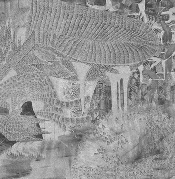 Художница Чон Юнгён, которая живет и работает в Лондоне, предлагает свое видение проблемы гармоничного сосуществования человека и природы. Она создает гигантские архитектурные произведения, вдохновленные современным ландшафтами разных стран. На почти монохромных крупных холстах изображены абстрактные пейзажи, состоящие из филигранно прорисованных элементов, похожих на листья деревьев, стебли растений или перья птиц, которые образуют обтекаемые или остроугольные формы, изысканно переплетающиеся или, наоборот, резко врезающиеся в друг друга. В этом, далеко не идеальном, мире причудливых форм все взаимосвязано — так размышляет автор о возможности сосуществования конфликтующих противоположных явлений в современном мире.