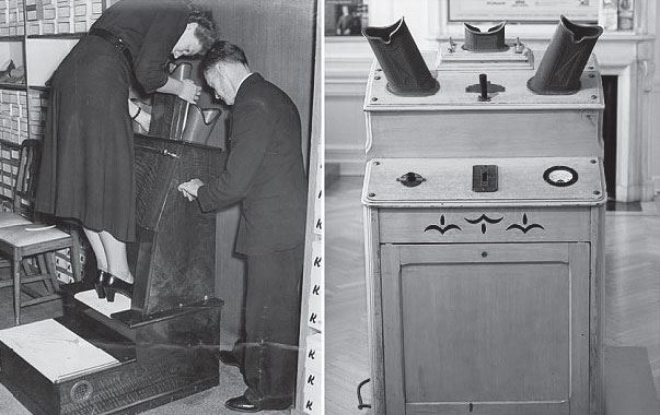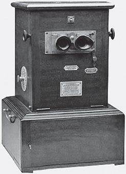 Этому не поможет <… > никакой стереоскоп, лупоглазо и грозно-молчаливо придающий такую выпуклость куполу и таким бесовским подобием пространства обмывающий гуляющих с карлсбадскими кружками лиц <… > аппарат стоял в приемной дантиста … – В конце XIX – начале ХХ века большие настольные стереоскопы (см. иллюстрацию) с наборами сдвоенных картинок для получения объемного изображения (главным образом, красоты природы и виды городов, в том числе известные церкви и соборы) устанавливались в читальнях, учебных заведениях и приемных.