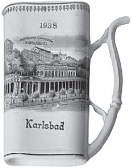 Минеральную воду было принято пить либо из стаканов, либо из специальных плоских кружек с ручкой-носиком, называвшихся карлсбадскими. См. образец 1938 года.