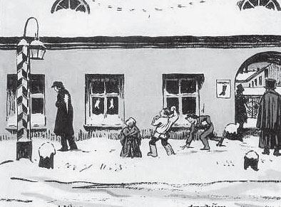 В стихотворении «Петербург» ( «Мне чудится в Рождественское утро …») Набоков вспоминал этот же вид: «Я помню все: Сенат охряный, тумбы / и цепи их чугунные вокруг / седой скалы, откуда рвется в небо / крутой восторг зеленоватой бронзы» (Набоков 1999–2000: I, 598). Чугунные или гранитные тумбы, иногда соединенные цепями, устанавливались в старом Петербурге и на некоторых центральных улицах, в частности на Невском проспекте, где они отделяли тротуар от проезжей части (Пискарев 2007: 20). «Вдоль тротуара, – вспоминал художник М. В. Добужинский (1875–1957), – стояли низенькие <… > тумбы, зимой на них лежал круглыми шапками снег, и было приятно сбить эту шапку или сделать маленький снежок» (Добужинский 1987: 9). Уличные тумбы с шапками снега – важная деталь на иллюстрации А. Н. Бенуа (1870–1960) к сцене второй части «Медного всадника» – «злые дети» бросают снежки в Евгения у сапожной мастерской.
