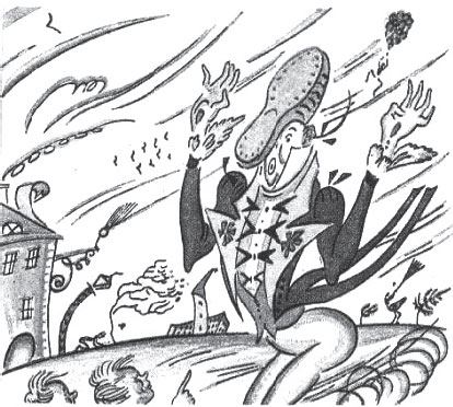 Набоков, как кажется, отсылает к сцене «фантастического полета» продавца воздушных шаров, которой открывается вторая часть «Трех толстяков» Ю. К. Олеши. Ср.: «Он летел над городом, повиснув на веревочке, к которой были привязаны шары. Высоко в сверкающем синем небе они походили на волшебную летающую гроздь разноцветного винограда. <… > Иногда продавцу удавалось посмотреть вниз. Тогда он видел крыши, черепицы, похожие на грязные ногти, кварталы, голубую узкую воду, людей-карапузиков и зеленую кашу садов» (Олеша 1974: 112, 113). Первое издание «Трех толстяков» (1928) иллюстрировал Добужинский, которого Набоков хорошо знал и высоко ценил. В 1912–1914 годах он давал Набокову уроки рисования (см. об этом в «Других берегах»: Набоков 1999–2000: V, 199–200), а в эмиграции состоял с ним в дружеской переписке (см.: Старк 1996); ему посвящено стихотворение Набокова «Ut pictura poesis» (Набоков 1999–2000: II, 555), написанное в апреле 1926 года после посещения большой выставки художника в Берлине. На иллюстрации Добужинского мы видим в правом верхнем углу улетающую связку шаров, действительно похожую на гроздь винограда.