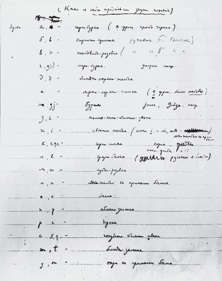 … у меня с детства в сильнейшей и подробнейшей степени audition color?e. – Набоков передает герою свой собственный «цветной слух», или, на современном научном языке, графемно-цветовую синестезию, то есть развившуюся у него в детстве способность воспринимать буквы окрашенными в определенные цвета. Еще в крымской записной тетради 1918 года он составил следующий перечень, озаглавленный «Как я себе представляю звуки алфавита» (см. ниже фотографию первой страницы):