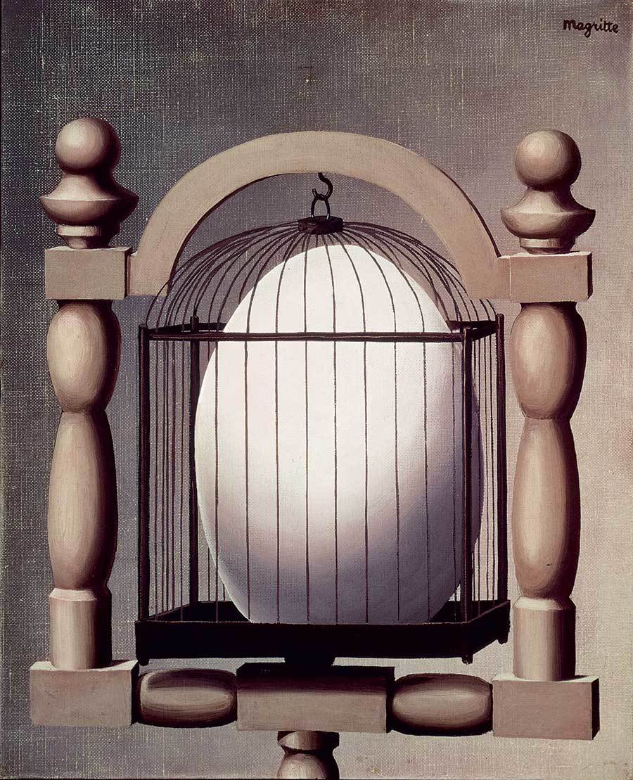 Когда Магритт объяснял свой творческий процесс в лекции под названием "Линия жизни", он привел знаменитый пример — будто, проснувшись как-то ночью, он в результате "дивной ошибки" представил, что вместо канарейки его жены Жоржетты в клетке оказалось яйцо. Отсюда (хотя "отсюда" — это всегда грубая скоропись) доктрина "избирательного сродства", "новый и удивительный поэтический секрет", переход от сюрреалистического метода сопоставления совершенно несвязанных объектов к магриттовскому противопоставлению тонко (а иногда не очень тонко) связанных. Или если воспользоваться словами самого Магритта: