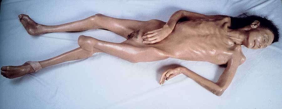Почти за сто лет до того французский врач и скульптор Поль Рише (1849–1933) снял слепок с мертвого тела. Получилась фигура обнаженной, худой, преждевременно состарившейся женщины, чье тело было изуродовано страданием. Название или, точнее, пометка указывает, что она умерла от "суставного ревматизма", но подзаголовок — "La V?nus ataxique"("Атаксическая Венера") — гораздо красноречивее. Атаксия — это внешнее проявление сухотки, третичного сифилиса нервной системы. Сухотка вызывает одну из самых мучительных разновидностей боли, какая только встречается в медицине, так что речь идет о теле (или копии тела), знакомом с бесконечной мукой. Левая рука почти вывернута внутрь на суставе, правая ступня повернута на девяносто градусов, левое колено причудливо раздулось. Вполне возможно, что это пример "колена Шарко", классического проявления атаксии. Неудивительно — ведь Рише отвечал за слепки, будучи "главным иллюстратором нервных патологий" в парижской больнице Сальпетриер, руководителем которой был великий невролог Ж. М. Шарко.