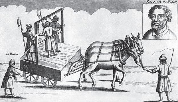 … недаром для палача все делается наоборот: хомут надевается верхом вниз, когда везут Разина на казнь, вино кату наливается не с руки, а через руку… – Набоков пересказывает сведения, содержащиеся в журнальной заметке о редкой английской книге «А Relation Concerning the Particulars of the Rebellion Lately Raised in Muscovy by Stenko Razin» (1672), поступившей в Императорскую публичную библиотеку. Описывая напечатанную в этой книге гравюру с изображением телеги, везущей Стеньку Разина на казнь, автор (подписавшийся: А. Б. В.) отмечал: «Телегу влекут 3 лошади в странной упряжке: у них хомуты надеты верхом вниз. Может быть, так делалось нарочно, для того, чтобы указать на принадлежность этого экипажа палачу, который, повидимому, и ведет лошадей. Известно, что для палача все делается наоборот, так что даже вино ему наливают не с руки» (Исторический вестник. 1901. Т. LXXXVI. Ноябрь. С. 736–737; см. также иллюстрацию).