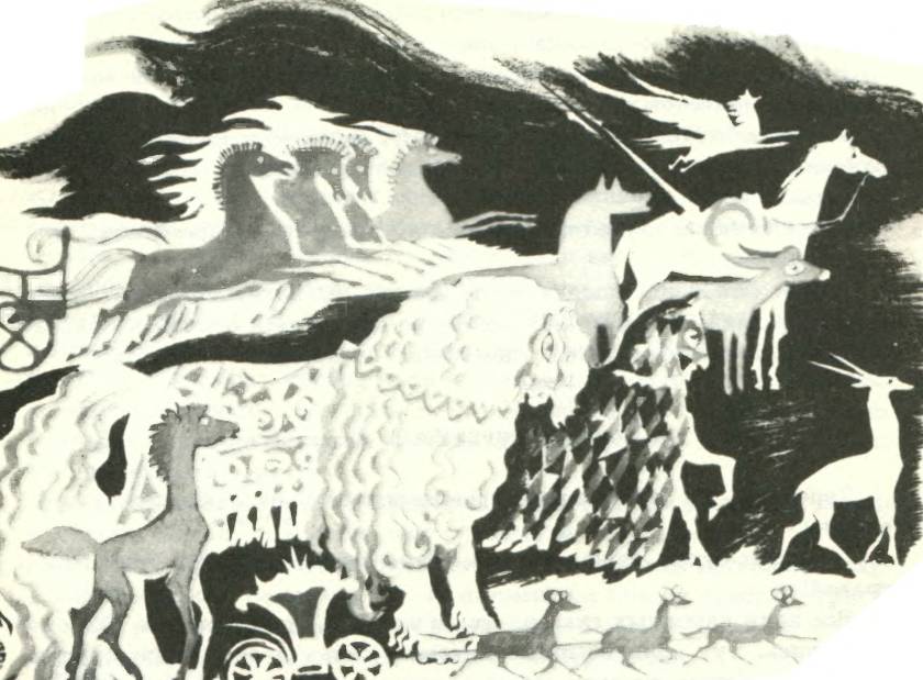 И был тут конь, который прежде служил Яге, и три коня, родившиеся у кобылицы от того, что на кухне мыли леща, а она выпила ополосок, и конь, который долго-долго находился в подземном царстве, в конюшне за семью замками, да еще на цепях, но бежал из плена, и такой конь, что, когда он мчится, пламя пышет из ушей, дым столбом валит, и такой, который дождем рассыпается в серебро, обращается в птицу, в орла, в старого человека.