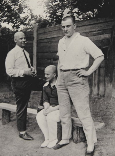 А. Родченко, В. Шкловский и В. Маяковский во дворе дома в Гендриковом переулке. 1926 г.