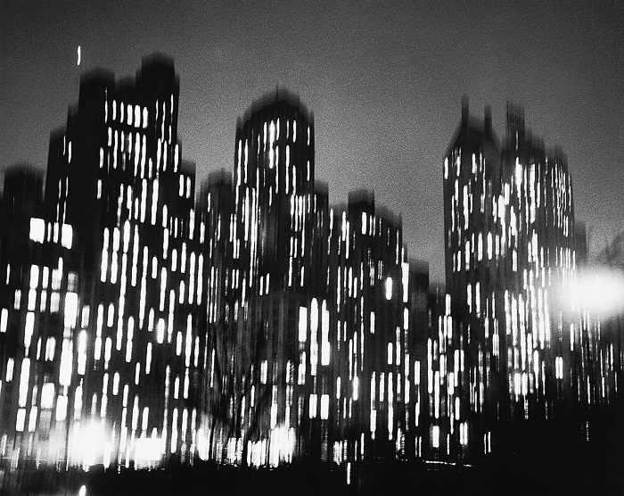 Богатая традиция американского модернизма проявляется в последних живописных и кинематографических работах Сары Моррис через переклички с важнейшими архитектурными достижениями, принадлежащими, в частности, Рэймонду Худу, который в 1929–1939 годах руководил работами в Рокфеллеровском центре в нью-йоркском Мидтауне, с новаторским импрессионизмом фотографий улиц и зданий Нью-Йорка, которые делал в 1940-х годах Тед Кронер (ил. 34), с невротичным гламуром фильма Александра Маккендрика «Сладкий запах успеха» (1957).