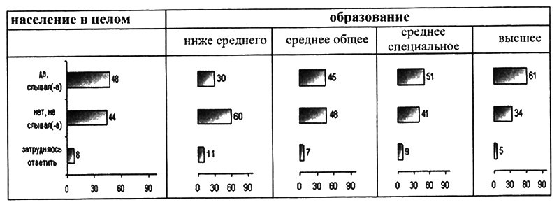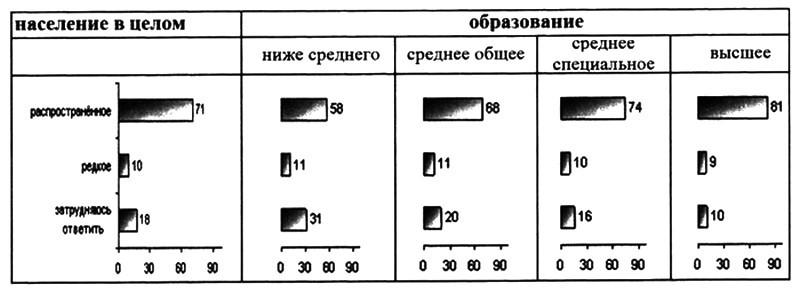 Доля считающих практики нелегального оформления документов распространенным явлением выше всего среди жителей столицы, хотя непосредственно слышать о таких случаях от своих знакомых им приходится не чаще, чем другим. Что же порождает у москвичей такое ощущение, если не опыт их окружения? Судя по высказываниям участников фокус-группы, проведенной в Москве, дело в доступности соответствующей информации. Обилие объявлений в публичных местах создает у людей впечатление, что существует совершенно свободный рынок «липовых» документов, которые можно приобрести так же легко, как и любой другой товар: