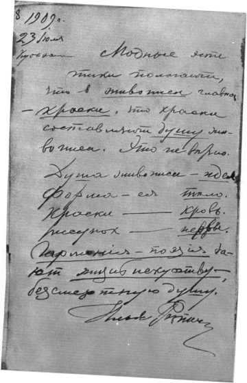И вдруг! Среди этих наклеенных на пыльные паспарту рисунков несколько альбомных листков: переплет оторван, начала и конца нет, по обращениям можно понять, что принадлежал этот альбом в свое время известному переводчику В. В. Уманову-Каплуновскому… 1909 год… Запись литератора Тенеромо… Высокопарное изречение об эмансипации женщин — подпись Н. Б. Нордман-Северовой, жены И. Е. Репина… И запись самого Репина! Страничка, на которой изложен взгляд его на искусство!