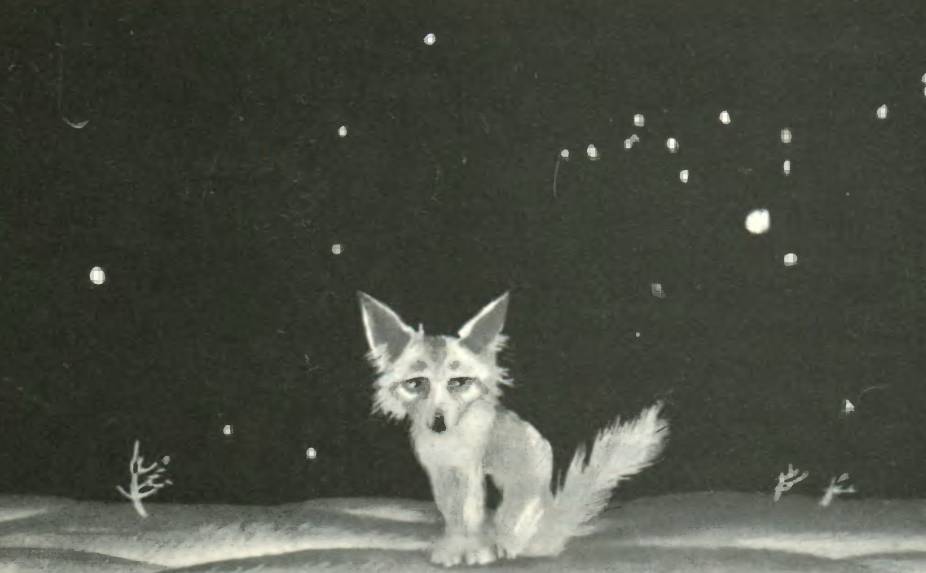 «Меня донимает любопытство, — записывал Экзюпери. — Какое здесь, в пустыне, зверье и чем оно кормится? Скорее всего, это фенеки, песчаные лисицы, хищники ростом не больше кролика с огромными ушами. Не могу утерпеть — иду по следу одного зверька... Прелесть, что за узор оставляет эта лапка с тремя растопыренными пальцами, словно изящно вырезанный пальмовый листок... Как отрадно видеть, что и здесь есть жизнь. И словно уже не так хочется пить... Но вот, наконец, и кладовые моих лисиц. Поодаль друг от друга, по одному на сто метров, чуть виднеются над песком крохотные сухие кустики, не выше суповой миски: они сплошь унизаны маленькими золотистыми улитками. Мой лис задерживается не у каждого кустика, снимет две-три ракушки — и отправляется в другой ресторан. Что это — игра?.. Если фенек станет наедаться досыта у первого же кустика, за две-три трапезы на ветвях не останется ни одной улитки. Но он осторожен и не мешает стаду плодиться...»