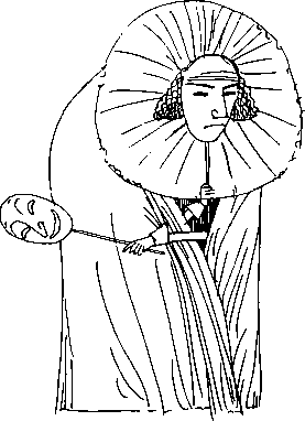 Портрет в первом полном собрании сочинений Шекспира 1623 года, выполненный гравером Мартином Дройсхутом, еще больше запутывает ситуацию. Лицо, больше похожее на маску, лоб огромный («как при водянке», отметил один шекспировед), плоское, торчащее в сторону ухо и будто приклеенные волосы. От мочки уха явственно видна резко очерченная линия, уходящая вниз под подбородок. Поскольку свет идет с разных сторон, эту линию нельзя назвать контуром тени, зато она очень напоминает контуры маски. Огромная голова кажется отделенной от туловища плоским, напоминающим секиру или блюдо, плоеным[25] воротником.