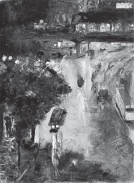 Федор Константинович сел <… > около широкого окна, за которым мокро чернела блестящая ночь <… > с гремящим, многооконным, отчетливо-быстро озаренным снутри электрическим поездом, скользившим над площадью по виадуку, в пролеты которого внизу тыкался и все не мог найти лазейку медленный, скрежещущий трамвай. – Ежегодные собрания Союза русских журналистов и литераторов (см. выше) проходили в ресторанах на площади Ноллендорф (Nollendorfplatz), в 1920-е годы в «Леоне» («Caf? Leon»), а в 1930-е – в «Ротес Хауз» («Rotes Haus»). Из окна Набоков, как и Федор, мог видеть виадук, по которому ходили поезда городской железной дороги (S-Bahn), электрифицированной в 1928–1930 годах, и трамваи под ним. Немецкий художник Л. Ури (Lesser Uri, 1861–1931) на картине «Площадь Ноллендорф ночью» («Nollendorfplatz bei Nacht», 1925) изобразил тот же вид.