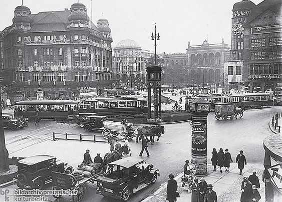 На некоторых открытках начала ХХ века Потсдамская площадь, действительно, просторна и пуста; стоят извозчики, ходят дамы в длинных платьях.