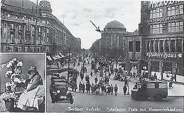 Потсдамская площадь многие десятилетия была главным цветочным рынком Берлина, а корпулентные цветочницы, на ней торговавшие, – одним из берлинских типов. Вот как они выглядели в конце XIX века (см. слева). На открытке 1930 года изображение толстой цветочницы добавлено к виду Потсдамской площади (см. справа).