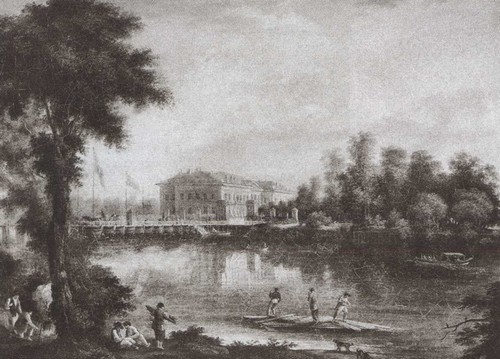 Дворец на Каменном острове. Раскрашенная гравюра К. Шульца по картине И. Мейера. Фрагмент. Первая половина XIX в.