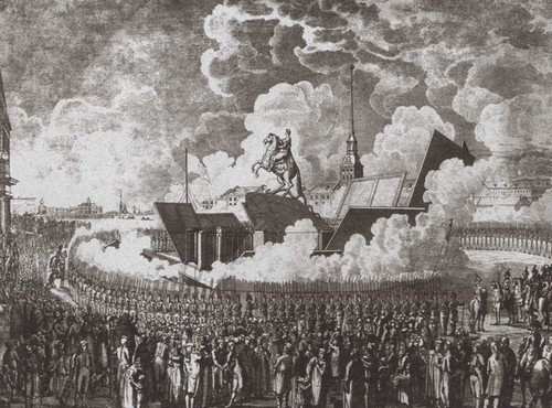 Открытие памятника Петру І в Петербурге. Гравюра А. К. Мельникова с рисунка А. П. Давыдова. 1782 г.