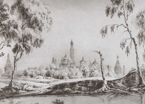 Вид Симонова монастыря со стороны «Лизина пруда». Литография с оригинала К. Рабуса. 1840-е гг.
