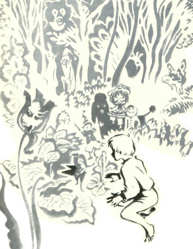 И тогда навстречу ждущим и уже заранее любящим сердцам, широко открытым детским глазам отовсюду — из капли росы и из разрезанной клеенки, где застряла обгорелая спичка, из венчиков цветков, лунных и солнечных теней — выходят, вылетают, выбегают маленькие человечки.