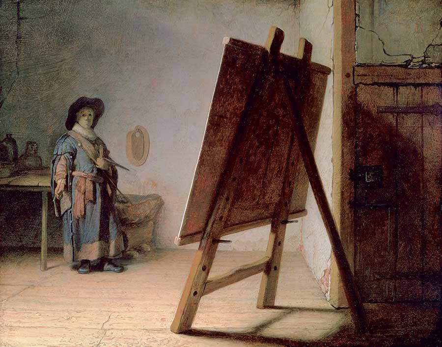 "Художник в мастерской" Рембрандта (ок. 1629) — небольшая картина с кристально ясным смыслом. На ней — студия в мансарде, со стен осыпается побелка; наблюдатель будто бы сидит на полу в уголке. Справа, в тени, — дверь. В центре, развернутый от нас, возвышается гигантский мольберт с картиной. Слева, едва достигая ростом середины мольберта, стоит художник с кистью и муштабелем в руке, одетый в рабочий халат и шляпу. Свет на него не падает, но мы видим в общих чертах его круглое лицо: он разглядывает картину. Источник света — за границами кадра, слева вверху. Свет падает в основном на дощатый пол, окрашивая его в цвет спелого зерна, и на левый край холста на мольберте, акцентируя его сверкающей вертикальной линией. Но поскольку источник освещения не показан, в нашем сознании происходит подмена: кажется, будто бы сама картина озаряет светом пол (но не художника, застывшего подобно манекену). И нам открывается смысл: источник света — в творчестве; оно само сообщает суть и смысл художнику, а не наоборот.