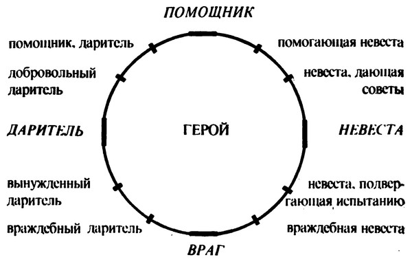 Е.М. Мелетинский в своей работе «Герой волшебной сказки. Происхождение образа» (1958) сконструировал более подробно разработанный поперечный разрез связей, соединяющих друг с другом действующих лиц волшебной сказки: