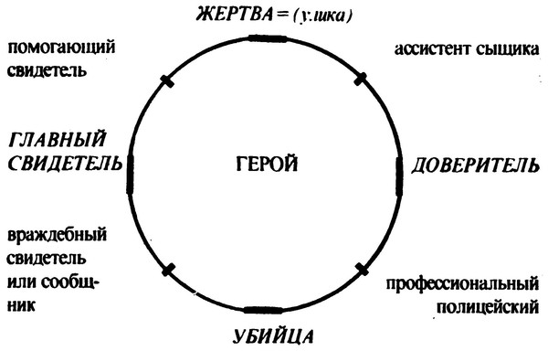 В.Я. Пропп в своей книге «Морфология сказки» волшебную сказку с семью действующими лицами характеризует как усложненную своеобразную историю. Все эти семь ролей (функций) имеются и в детективной истории, к тому же закономерно (не так, как в романе или новелле):
