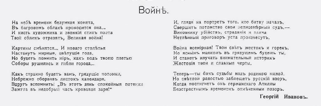 … в журналах печатались стишки, посвященные войне: Теперь ты бич судьбы над родиною милой. / Но светлой радостью заблещет русский взор, / Когда постигнет он германского Атиллы / Бесстрастным временем отмеченный позор! – В заметке на полях принадлежавшего ему экземпляра английского перевода «Подвига» Набоков указал, что здесь цитируется строфа из стихотворения Георгия Иванова (см.: Shapiro 1999: 146). Источник цитаты установил А. Ю. Арьев. Это последняя строфа забытого патриотического стихотворения Г. Иванова «Войне» («На небе времени безумная комета…»), напечатанного лишь однажды, в журнале «Нива» (1917. № 7. 18 февраля. С. 104), и не вошедшего ни в один прижизненный сборник поэта (см.: Иванов 2009: 392–393, 681–682).