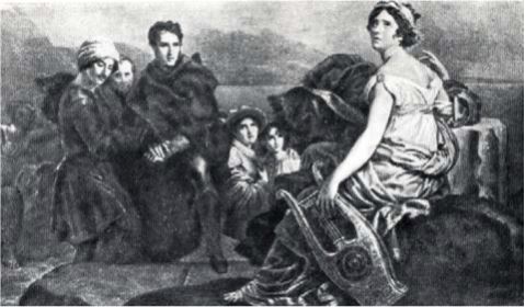 Жермена де Сталь-Голштейн (1766-1817) – дочь министра финансов при дворе Людовика XVI – Неккера. Несколько драм, не имевших успеха, и работу, посвященную Руссо, она издала еще до революции. Во время революции де Сталь придерживается либеральных взглядов. С 1792 по 1797 она находится на своей родине, в Швейцарии, затем возвращается в Париж и возглавляет литературный кружок, явно оппозиционный Наполеону. Кстати взаимная неприязнь с Наполеоном привела де Сталь к высылке из Франции в 1802 году. Немецкий писатель и поэт Гейне говорил, что «…мадам де Сталь имела нелепость назвать наполеона Робеспьером на лошади…».
